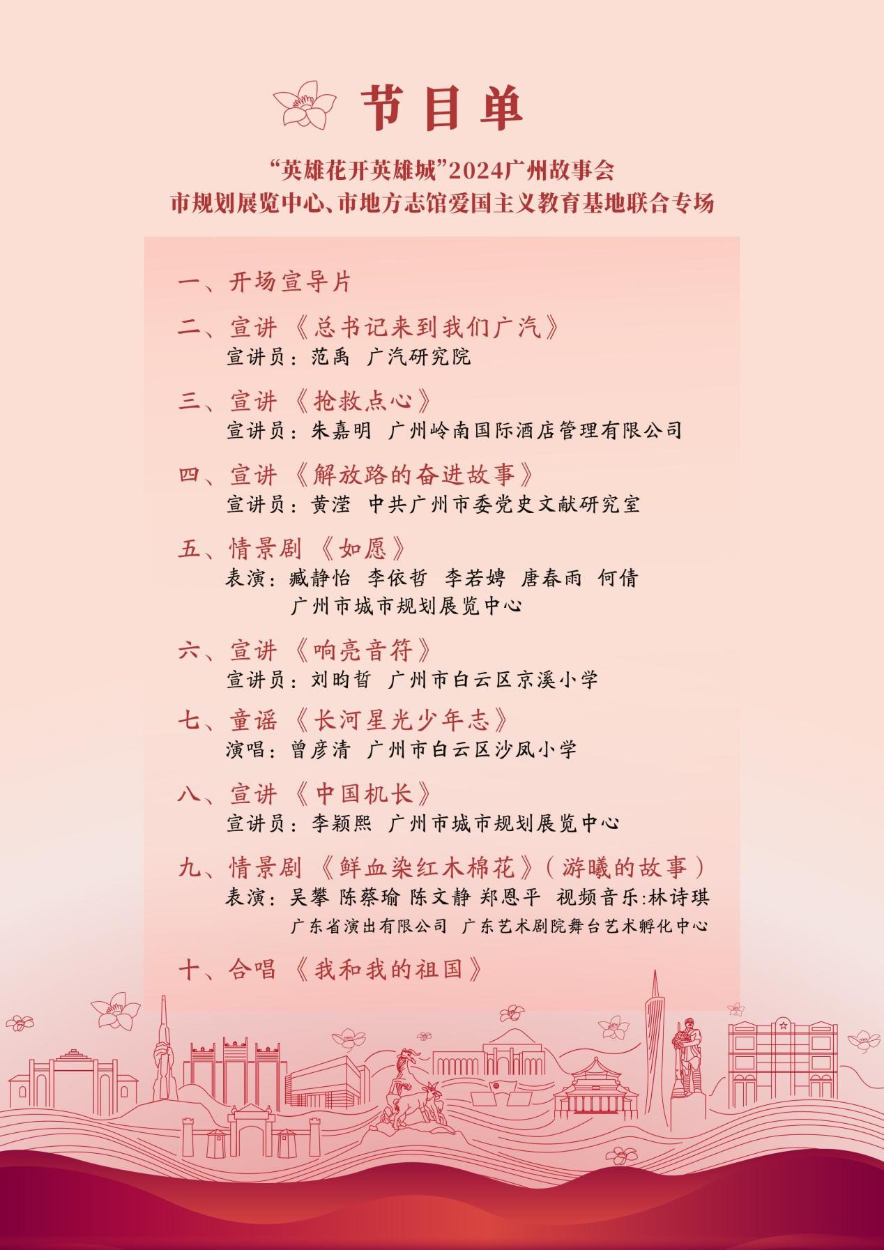 為深入學(xué)習(xí)貫徹黨的二十屆三中全會(huì)精神,大力弘揚(yáng)以愛國(guó)主義為核心的民族精神和以改革創(chuàng)新為核心的時(shí)代精神,以實(shí)際行動(dòng)慶祝中華人民共和國(guó)成立75周年,“英雄花開英雄城”2024廣州故事會(huì)市規(guī)劃展覽中心、市地方志館愛國(guó)主義教育基地聯(lián)合專場(chǎng)宣講活動(dòng)來(lái)啦!