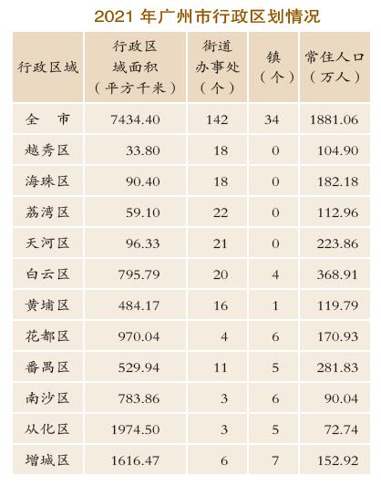 中華人民共和國(guó)成立后,廣州市的行政隸屬關(guān)系和行政區(qū)劃設(shè)置有過(guò)幾次較大的變動(dòng)和調(diào)整。解放初期,廣州市劃分為28個(gè)區(qū),其中城區(qū)20個(gè)(逢源、黃沙、西禪、長(zhǎng)壽、沙面、陳塘、太平、惠福、靖海、小北、德宣、西山、東堤、漢民、前鑒、大東、東山、洪德、蒙圣、海幢)、水上區(qū)1個(gè)(珠江區(qū))、郊區(qū)7個(gè)(南岸、沙河、芳村、石牌、新洲、瀝滘、三元里)。1950年,調(diào)整行政區(qū)劃設(shè)置,把28個(gè)區(qū)合并為16個(gè)區(qū),其中城區(qū)8個(gè)(長(zhǎng)壽、河南、惠福、永漢、太平、越秀、大東、荔灣)、水上區(qū)1個(gè)(珠江區(qū))、郊區(qū)7個(gè)(南岸、沙河、芳村、石牌、新洲、瀝滘、三元里)。1951年10月,把郊區(qū)7個(gè)調(diào)整為4個(gè)(白云、芳村、西村、新滘)。1952年9月,把原來(lái)8個(gè)城區(qū)合并為5個(gè)(東區(qū)、中區(qū)、西區(qū)、北區(qū)、河南區(qū)),保留珠江區(qū)。1953年5月,西村區(qū)撤銷(xiāo)并入白云區(qū);同年6月,黃埔區(qū)成立。1956年6月,黃埔、白云、新滘3個(gè)區(qū)合并為廣州市郊區(qū)。1958年12月,撤銷(xiāo)珠江區(qū),同年撤銷(xiāo)廣州市郊區(qū);原屬郊區(qū)的人和、太和、竹料、鐘落潭4個(gè)公社與花縣合并設(shè)立廣北縣,劃歸廣州市;原郊區(qū)的三元里、鶴洞、江村、石井、沙河、新滘、黃埔、蘿崗8個(gè)公社設(shè)立廣州市近郊區(qū)。1959年3月,撤銷(xiāo)廣北縣,把花縣劃回佛山地區(qū);恢復(fù)廣州市郊區(qū),原從廣州市郊區(qū)劃出的4個(gè)公社劃回廣州市郊區(qū);撤銷(xiāo)廣州市近郊區(qū)。1960年4月,從佛山地區(qū)劃出花縣、從化縣歸屬?gòu)V州市;8月,撤銷(xiāo)中區(qū)、郊區(qū),設(shè)立越秀區(qū)、東山區(qū)、海珠區(qū)、荔灣區(qū)4個(gè)城區(qū)和黃埔區(qū)、芳村區(qū)、江村區(qū)3個(gè)郊區(qū)。1961年,原屬韶關(guān)地區(qū)的佛岡縣劃歸廣州市(1963年又劃歸韶關(guān)地區(qū)管轄)。1962年5月,將黃埔區(qū)、芳村區(qū)、江村區(qū)3個(gè)郊區(qū)合并為1個(gè)郊區(qū)。1973年,重新從郊區(qū)劃出部分區(qū)域再設(shè)黃埔區(qū)。1975年,把原屬佛山地區(qū)的番禺縣、惠陽(yáng)地區(qū)的增城縣和龍門(mén)縣、韶關(guān)地區(qū)的新豐縣劃歸廣州市。1983年,把韶關(guān)地區(qū)的清遠(yuǎn)縣、佛岡縣劃歸廣州市。1985年1月,從廣州市郊區(qū)劃出部分區(qū)域,設(shè)置天河區(qū)、芳村區(qū)。1987年1月,把廣州市郊區(qū)改稱為白云區(qū)。1988年,廣州市行政區(qū)劃作出較大調(diào)整,1月7日,把龍門(mén)縣劃歸惠州市管轄,新豐縣劃歸韶關(guān)市管轄,清遠(yuǎn)縣和佛岡縣劃歸清遠(yuǎn)市管轄。1992年5月,撤銷(xiāo)番禺縣,設(shè)立番禺市(縣級(jí));1993年6月,撤銷(xiāo)花縣,設(shè)立花都市(縣級(jí)),同年12月,撤銷(xiāo)增城縣,設(shè)立增城市(縣級(jí));1994年3月,撤銷(xiāo)從化縣,設(shè)立從化市(縣級(jí))。以上4個(gè)縣級(jí)市均隸屬?gòu)V東省人民政府,由廣州市代管。2000年5月,分別撤銷(xiāo)番禺市和花都市(縣級(jí)),設(shè)立番禺區(qū)和花都區(qū)。2005年4月,廣州市行政區(qū)劃作出重大調(diào)整,撤銷(xiāo)東山區(qū)、芳村區(qū),設(shè)立南沙區(qū)、蘿崗區(qū)。2014年1月,國(guó)務(wù)院批準(zhǔn)廣州市部分行政區(qū)劃調(diào)整:撤銷(xiāo)黃埔區(qū)、蘿崗區(qū),設(shè)立新的黃埔區(qū);撤銷(xiāo)縣級(jí)從化市,設(shè)立從化區(qū);撤銷(xiāo)縣級(jí)增城市,設(shè)立增城區(qū)。至2021年12月,廣州市轄越秀、海珠、荔灣、天河、白云、黃埔、花都、番禺、南沙、從化、增城11個(gè)區(qū),共34個(gè)鎮(zhèn)、142個(gè)街道。