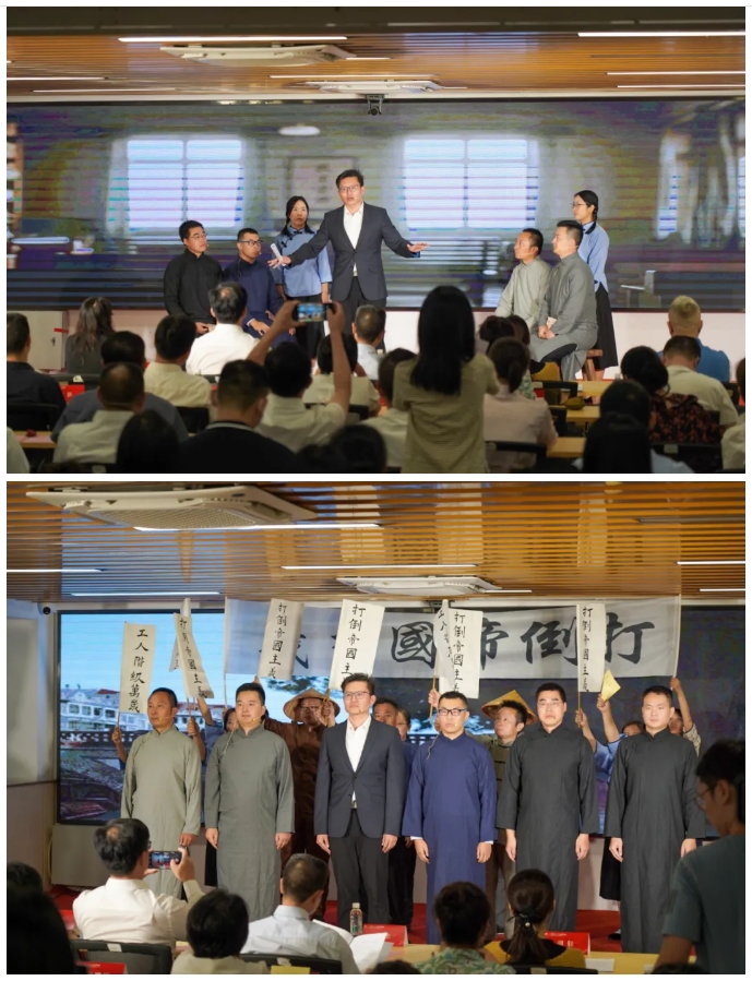 當(dāng)天,備受矚目的原創(chuàng)舞臺劇《紅色甲工之省港風(fēng)暴》成功首演,為觀眾帶來了一場視覺與心靈的藝術(shù)盛宴。歷史上,在省港大罷工中,楊匏安、劉爾崧、周文雍等一批青年學(xué)子為人民解放、民族獨(dú)立不懈奮斗,用青春和熱血澆灌出偉大的紅色甲工精神。該劇通過生動的舞臺表演和細(xì)膩的情感刻畫,以廣東省立第一甲種工業(yè)學(xué)校師生組織參與省港大罷工的革命歷史為背景,再現(xiàn)了上世紀(jì)二十年代那段波瀾壯闊的歷史,讓觀眾在藝術(shù)的熏陶中重溫那段崢嶸歲月,感受革命先輩們的不朽精神。