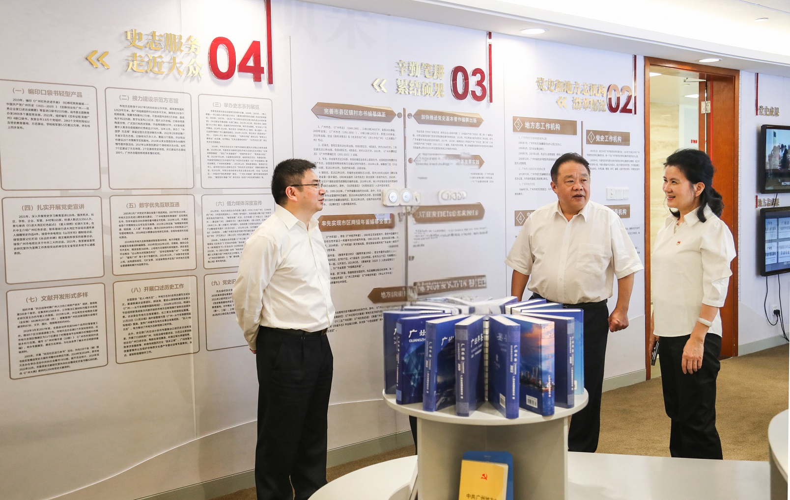 陳文學主任一行先后參觀了市地方志館大事長廊及城、商、政、水、人、文六大主展區(qū),習近平新時代中國特色社會主義思想廣州實踐專題展、新時代廣州之最展、廣州扶貧展、廣州全面小康展、區(qū)鎮(zhèn)村展、大灣區(qū)展、港穗雙城展、廣州市地方志事業(yè)40年展、數(shù)字史志成果展等專題展,以及市民錄音棚、電子評稿室、音像采編室、地方志展示室、年鑒展示室、地方史展示室、自然村普查成果展示室等多個配套功能區(qū)。