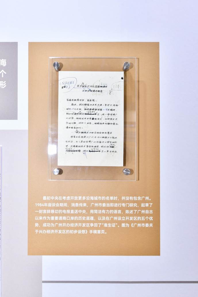 此次展覽展線共350米,展出照片、檔案、實(shí)物、視頻等600余件,其中《廣州市委關(guān)于興辦經(jīng)濟(jì)開發(fā)區(qū)的初步設(shè)想》手稿、黃埔區(qū)彩色航空攝影圖、廣州開發(fā)區(qū)第一個對外招商引資英文版視頻等84件檔案文獻(xiàn)資料首次對外公開展出?!稄V州市委關(guān)于興辦經(jīng)濟(jì)開發(fā)區(qū)的初步設(shè)想》手稿是廣州市委向中央爭回廣州開發(fā)區(qū)“準(zhǔn)生證”的關(guān)鍵文件,也是廣州開發(fā)區(qū)歷史上的首份紙質(zhì)檔案,證實(shí)了廣州開發(fā)區(qū)早期選址的4個方案,現(xiàn)收藏于廣州市檔案館;黃埔區(qū)彩色航空攝影圖拍攝于1984年12月并于1991年5月以1:10000的比例尺制作而成,上面清晰地標(biāo)注出地名、河流等信息,可以清晰看到廣州開發(fā)區(qū)西區(qū)遍地蕉林灘涂的原始面貌,見證了廣州開發(fā)區(qū)和黃埔區(qū)割舍不斷的緊密聯(lián)系,現(xiàn)收藏于黃埔區(qū)國家檔案館;廣州開發(fā)區(qū)第一個對外招商引資英文版視頻是由一名曾在廣州開發(fā)區(qū)工作的退休教授捐贈,此宣傳片英文手稿和錄像帶英文配音解說皆由他完成。這些泛黃的檔案,將觀眾的記憶瞬間拉回40年前的廣州開發(fā)區(qū),再現(xiàn)廣州開發(fā)區(qū)創(chuàng)業(yè)初期熱火朝天的景象,并通過新舊檔案對比的強(qiáng)烈視覺沖擊,讓觀眾更加直觀、深刻地感受到廣州開發(fā)區(qū)滄海桑田的巨大變遷。