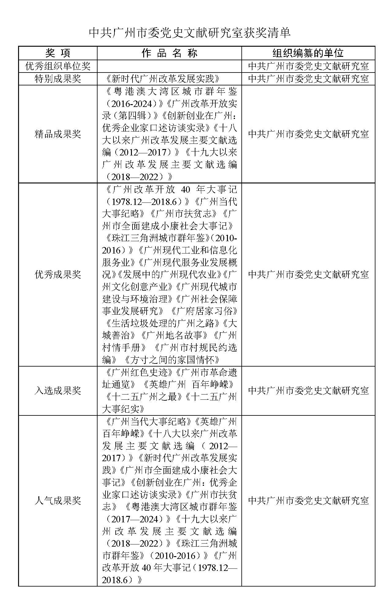 在12月31日舉行的第一屆廣東黨史文獻征集展示活動成果發(fā)布會上,中共廣州市委黨史文獻研究室獲第一屆廣東黨史文獻征集展示優(yōu)秀組織單位獎,我室編纂的1部文獻成果獲特別成果獎、5部獲精品成果獎、18部獲優(yōu)秀成果獎、5部獲入選成果獎,其中11部同步獲人氣成果獎。