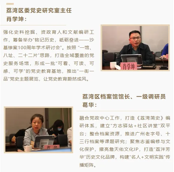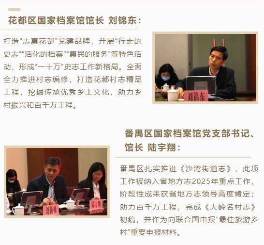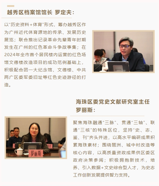 聚焦中心大局,主動擔(dān)當(dāng)作為,深挖史志資源強(qiáng)化資政服務(wù)功用。一是積極服務(wù)國家發(fā)展戰(zhàn)略。助力“百千萬工程”,廣州市和花都區(qū)、黃埔區(qū)兩級史志部門聯(lián)合省地方志辦、省文化廳等11個單位在花都區(qū)紅山村、黃埔區(qū)文沖街道幸福里和長洲島舉辦全省多彩鄉(xiāng)村系列實(shí)踐活動啟動會、推進(jìn)會、音樂會三期,獲《人民日報》、新華網(wǎng)等20多家主流媒體報道,賦能鄉(xiāng)村振興?!皬V州市情”微信公眾號推出《千村千貌繪廣州》欄目,先后推介6個特色自然村,天河、從化、黃埔、海珠、增城提供相關(guān)資料,社會反響良好。各區(qū)通過編纂《全粵村情》、開發(fā)利用紅色資源,賦能美麗鄉(xiāng)村建設(shè)。二是充分挖掘史志資源開展資政。為貫徹落實(shí)11月市委十二屆第153次常委會議聽取黨史工作匯報的會議精神,總結(jié)促進(jìn)數(shù)字化、數(shù)智化發(fā)展的主要成果,分析問題和不足,提出對策建議,黃埔區(qū)形成3篇、荔灣區(qū)形成2篇、海珠區(qū)形成1篇加快數(shù)字化轉(zhuǎn)型的資政文章。海珠區(qū)以琶洲人工智能與數(shù)字經(jīng)濟(jì)區(qū)發(fā)展為主題呈報研究成果,從化區(qū)報送《林樹森同志對從化的發(fā)展定位檔案摘編》等獲區(qū)委領(lǐng)導(dǎo)高度肯定。三是踐行宗旨意識提升為民服務(wù)能力。各區(qū)深化資料利用,推進(jìn)《越秀印象》《小洲故事:從嶺南水鄉(xiāng)到藝術(shù)村落》《龍鳳尋史——從廣州發(fā)現(xiàn)歷史》《濱江之路》《黃埔區(qū)情手冊》《多彩鄉(xiāng)村 幸福黃埔》等20部地情著述編纂,豐富公共文化供給。四是精心組織研討活動。6月,“紀(jì)念黃埔軍校建校100周年學(xué)術(shù)研討會”順利召開。12月,荔灣區(qū)主辦召開“作為‘城市經(jīng)驗(yàn)’的廣州史研究學(xué)術(shù)研討會”;籌備召開“銘記歷史,砥礪奮進(jìn)——沙基慘案100周年學(xué)術(shù)研討會”。