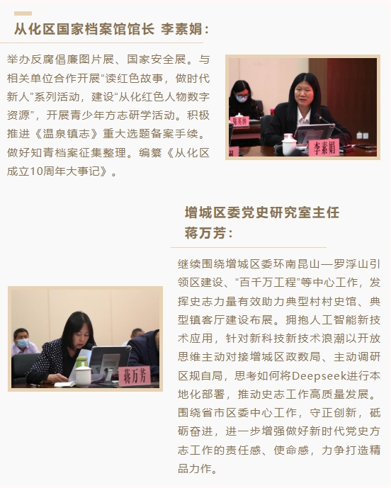 會上,各區(qū)史志工作機(jī)構(gòu)主要負(fù)責(zé)人圍繞“以改革創(chuàng)新精神推動史志工作高質(zhì)量發(fā)展”主題,立足工作實(shí)際,聚焦主責(zé)主業(yè),介紹了創(chuàng)新開展史志鑒編纂、資政輔治、宣傳教育、開發(fā)利用、文獻(xiàn)征編、信息化建設(shè)的工作思路和舉措。